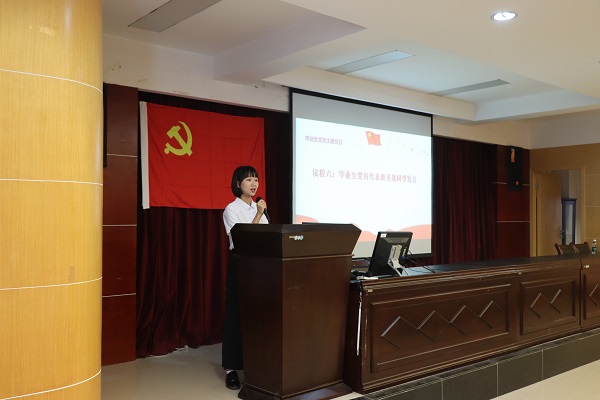 2018级数学一班唐圣晟代表毕业生党员发言,呼吁毕业生党员牢记党员身份,充分发挥党员的先锋模范作用,不忘初心,砥砺奋进。