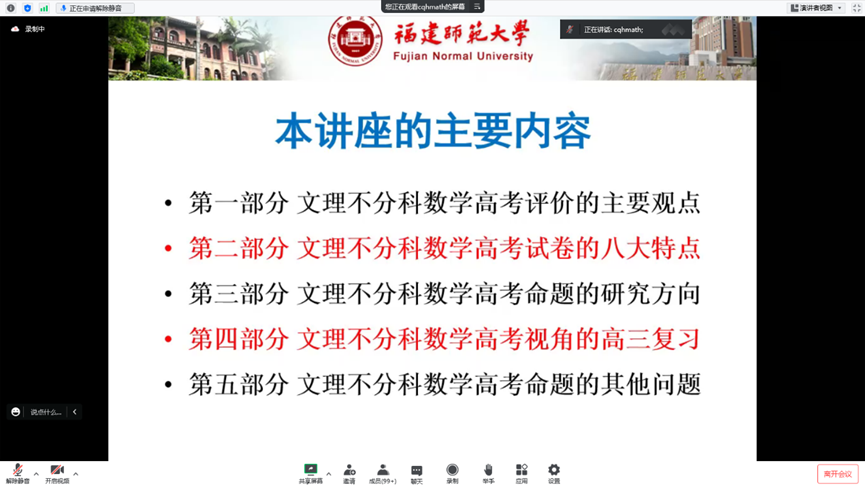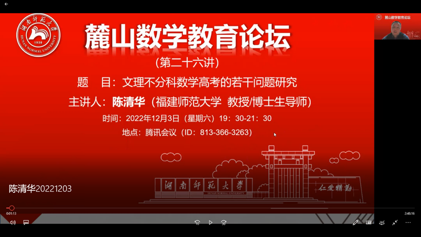 2022年12月3日星期六晚上7:30-9:30,福建师范大学陈清华教授做客韦德体育官方网站“麓山数学教育论坛”,通过腾讯会议平台进行了一场主题为“文理不分科数学高考的若干问题研究”的讲座。此次讲座由数学系副主任袁智强主持。