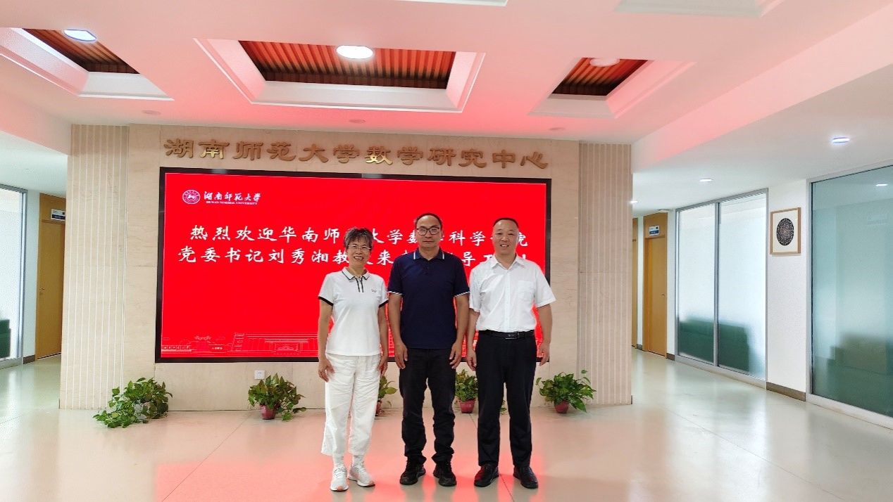 2025年8月10日上午,华南师范大学数学科学公司党委书记刘秀湘教授一行到访韦德体育官方网站数学研究中心。韦德体育官方网站数学与统计公司党委书记颜中玉、数学系副主任袁智强教授参与接待并座谈交流。