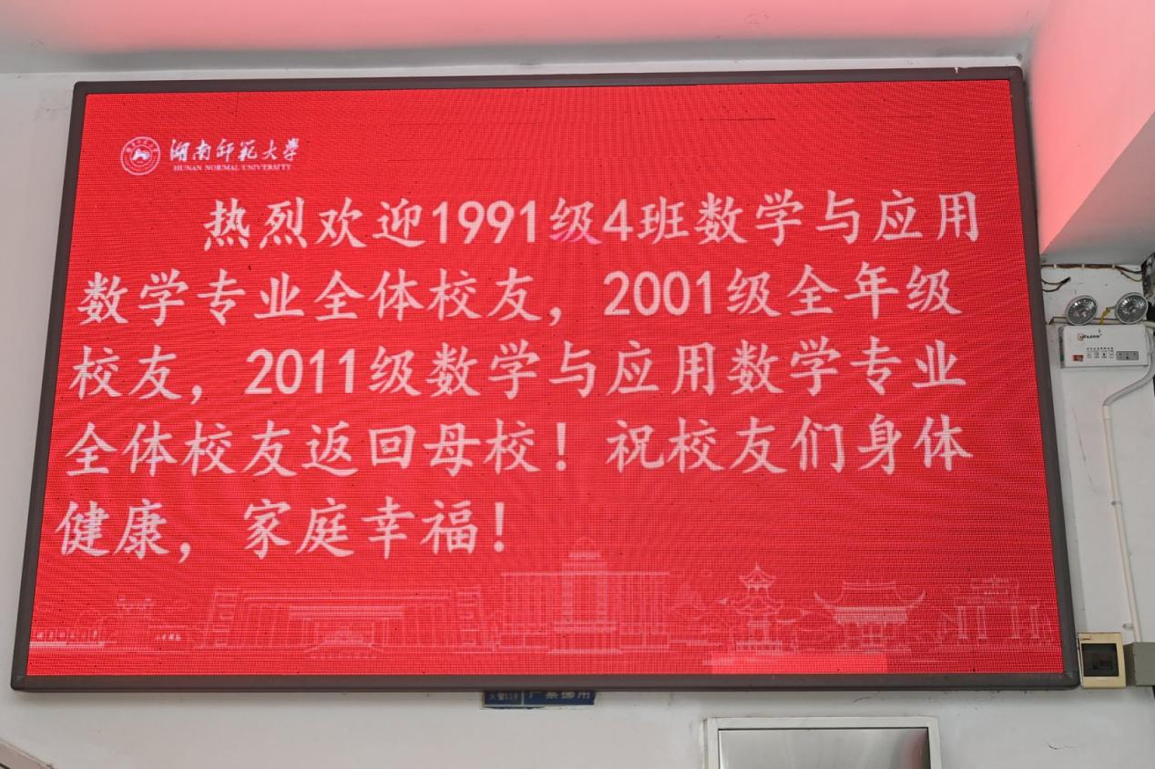 座谈由数学系91级4班班长文玉斌主持,他先做了简短发言,说了三个感谢,第一感谢母校和老师们的教育与培养,第二感谢国内外同学们的远道归来,第三感谢长沙市本地同学们的大力支持。