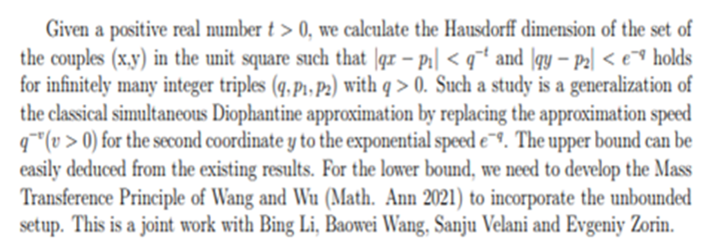 报告人简介:廖灵敏,2008年获得法国Picardie大学及武汉大学博士学位。2010年获得法国东巴黎大学终身教职。2017年获Habilitation。2022年7月起任武汉大学教授博士生导师。主要从事分形几何,动力系统,度量数论等方面的研究。 在包括J.Eur.Math.Soc.,Math.Ann.,Adv.Math.,Int.Math.Res.Not., Trans.Amer.Math.Soc., Ergod.Theory Dyna.Syst.等在内的国际期刊发表论文41篇。